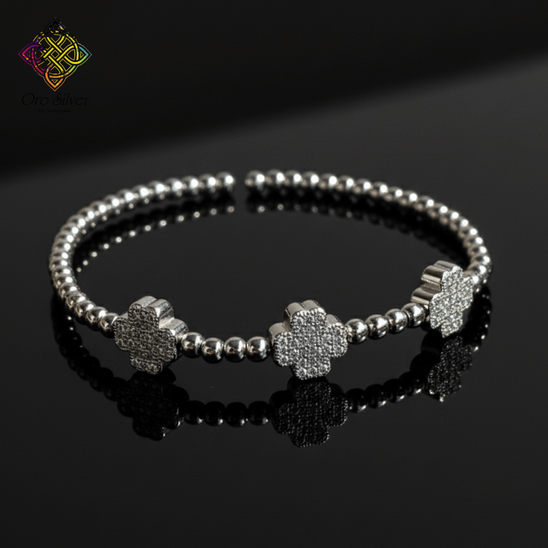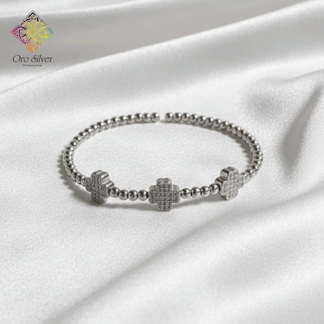 Elevate your elegance with this stunning 92.5 Sterling Silver Clover Bracelet, designed with a sleek beaded band and three beautifully crafted CZ-studded clover charms. The premium cubic zirconia stones add a refined sparkle, while the high-quality sterling silver ensures long-lasting shine and durability.