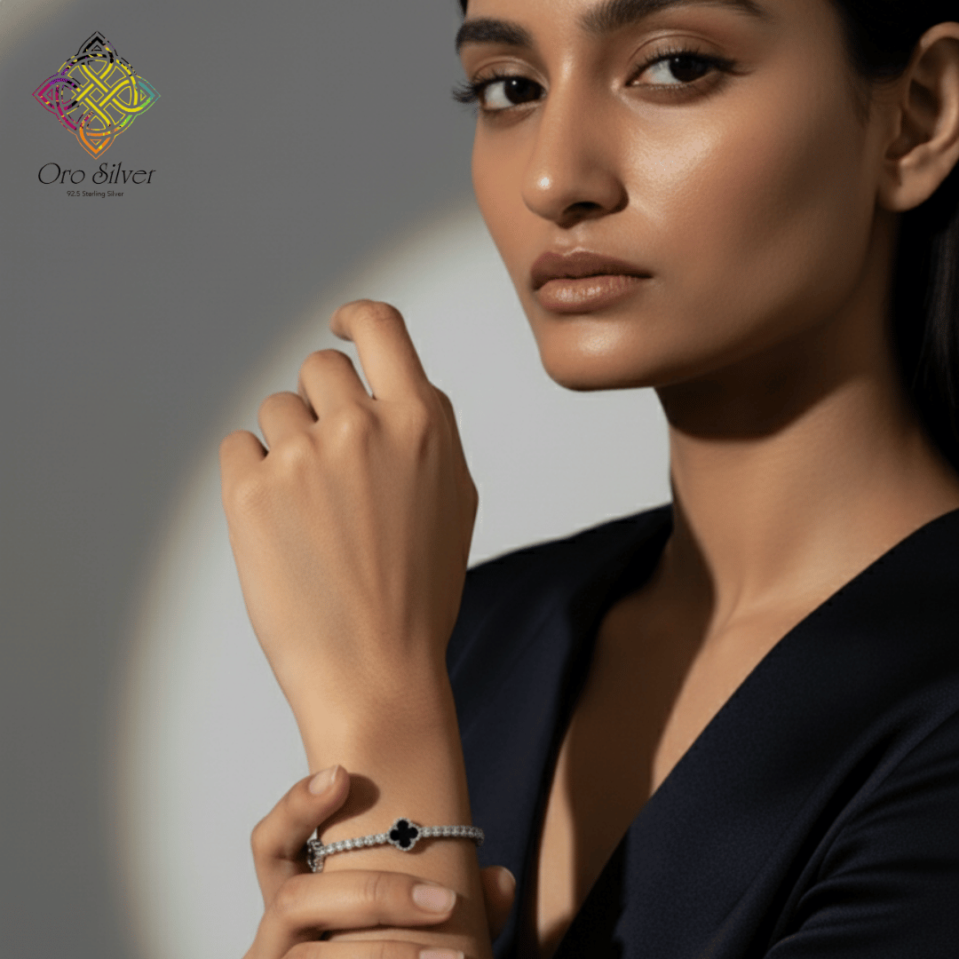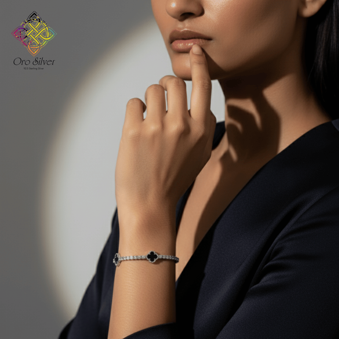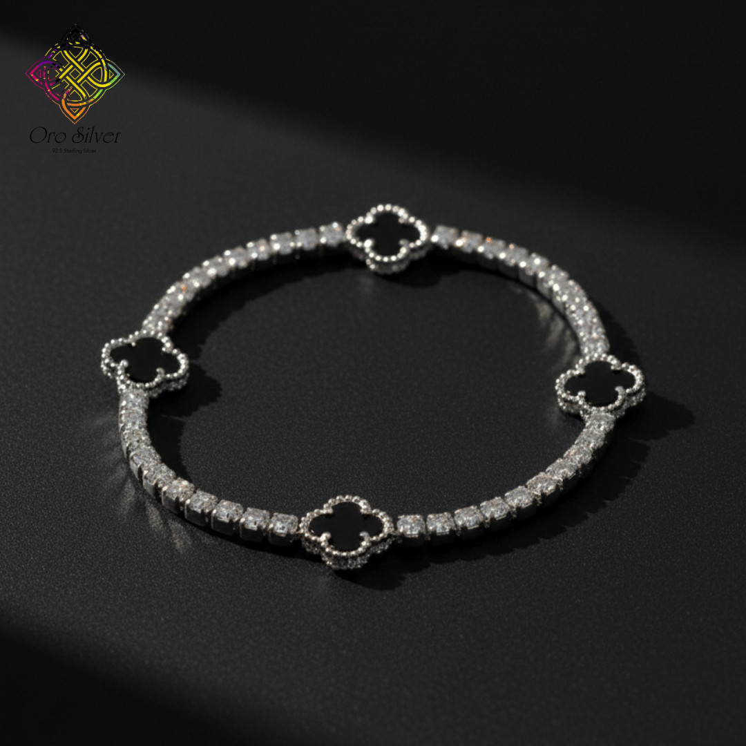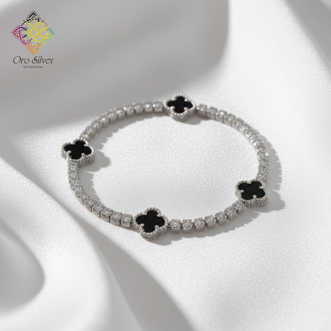 Elevate your elegance with this stunning 92.5 silver Black Clover CZ Bracelet, designed to add a perfect blend of class and charm to your everyday look. Featuring a line of shimmering cubic zirconia stones and four striking black clover charms, this piece captures modern sophistication with a touch of bold style.