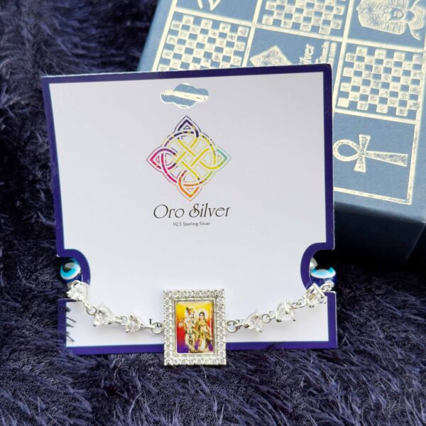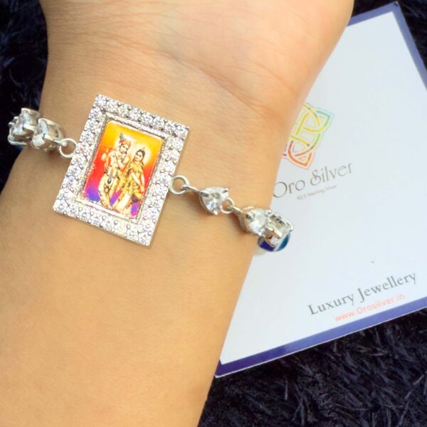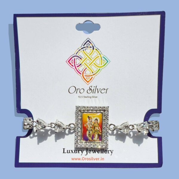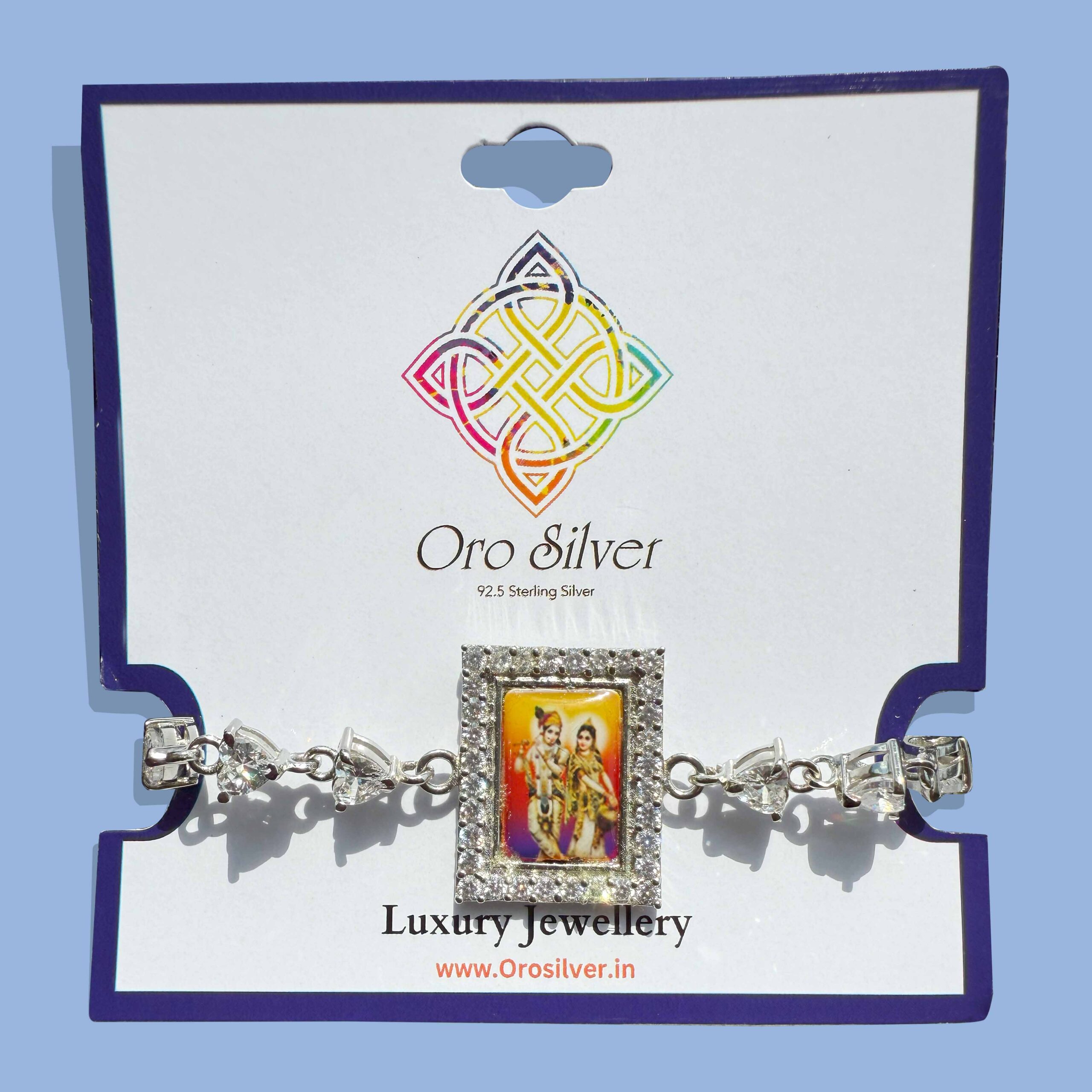 Celebrate eternal love and spiritual harmony with this Radha Krishna bracelet from Oro Silver, crafted in 92.5 Sterling Silver. This elegant piece beautifully blends devotion with luxury, featuring: